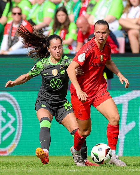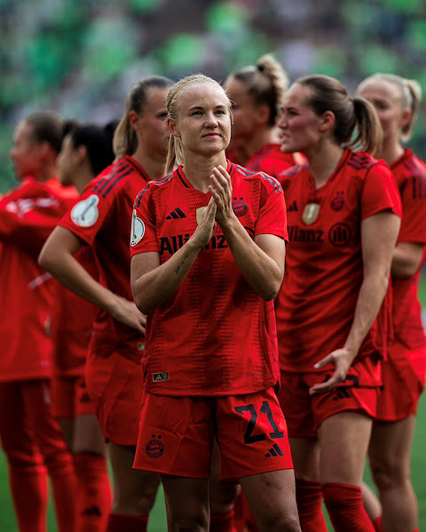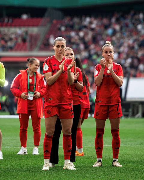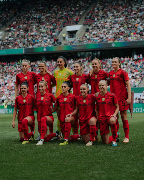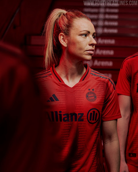 Update: The FC Bayern women debuted the brand-new 24-25 home kit in the DFB Cup final loss against VfL Wolfsburg yesterday. The dark maroon logos appeared black in some pictures due to lighting.