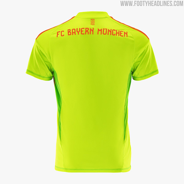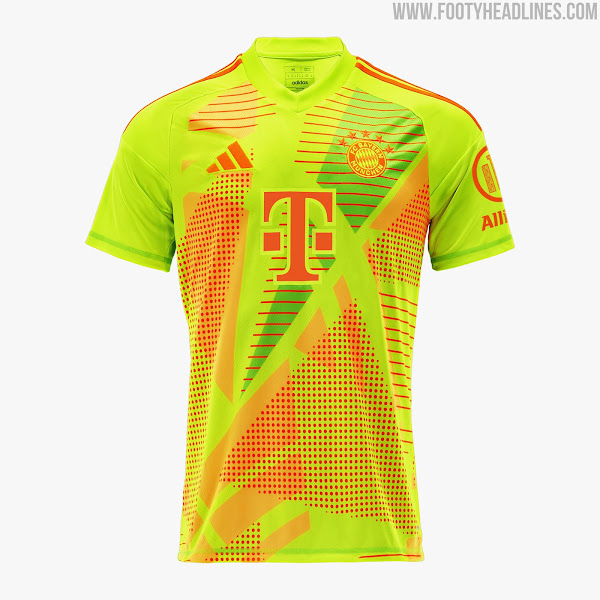 The Bayern Munich 24-25 goalkeeper kit has a striking design in fluo-green and fluo-red.