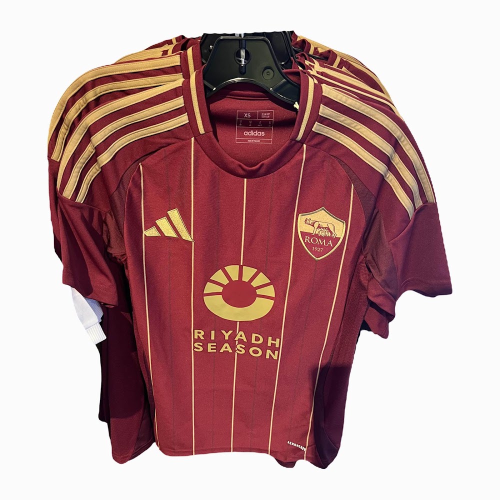 The new Adidas Associazione Sportiva Roma 2024-25 home shirt has a stylish color scheme, with the main color maroon combined with gold logos.