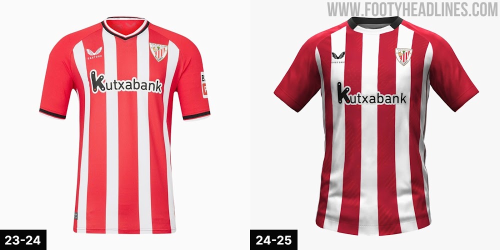 The red stripe on the Castore Bilbao 2024-2025 home jersey is a slightly darker shade of red than on their 23-24 home shirt.