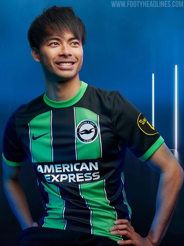The new Brighton 23-24 away kit design is an upgraded version of the popular green and black Errea striped away kit from ten years ago.