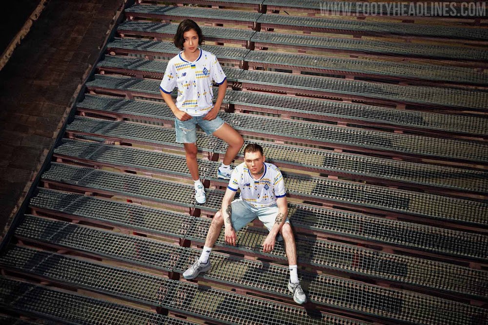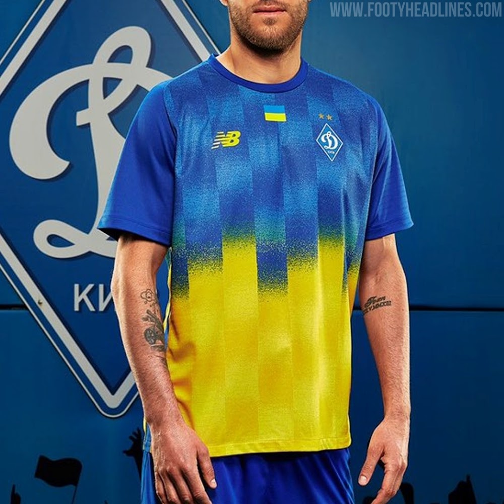 The New Balance Dynamo Kyiv 24-25 away shirt is blue on the top and yellow on the bottom, a direct reference to the Ukrainian flag, symbolizing patriotism and solidarity.