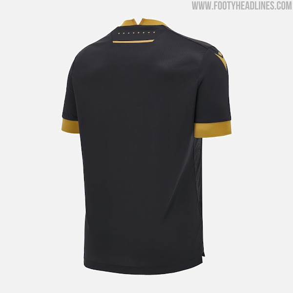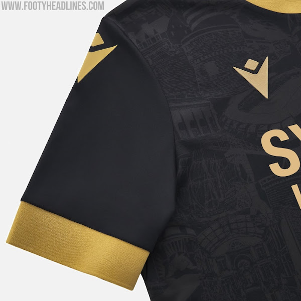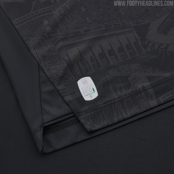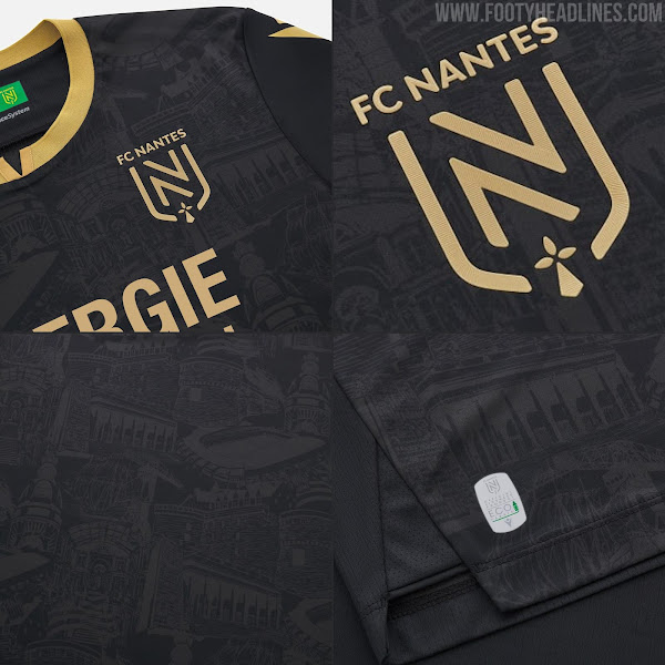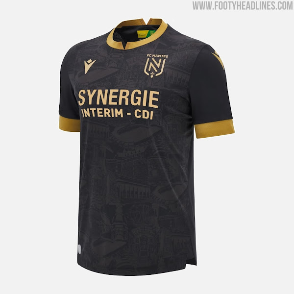 The Macron FC Nantes 2024-2025 away football shirt is elegantly designed in black and gold and features symbols and monuments of the city of Nantes.