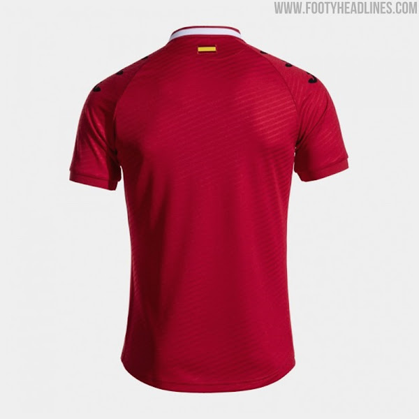 The Joma Getafe 2024-25 away shirt is predominantly dark red with white and blue accents.