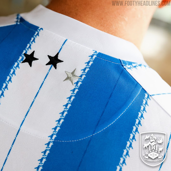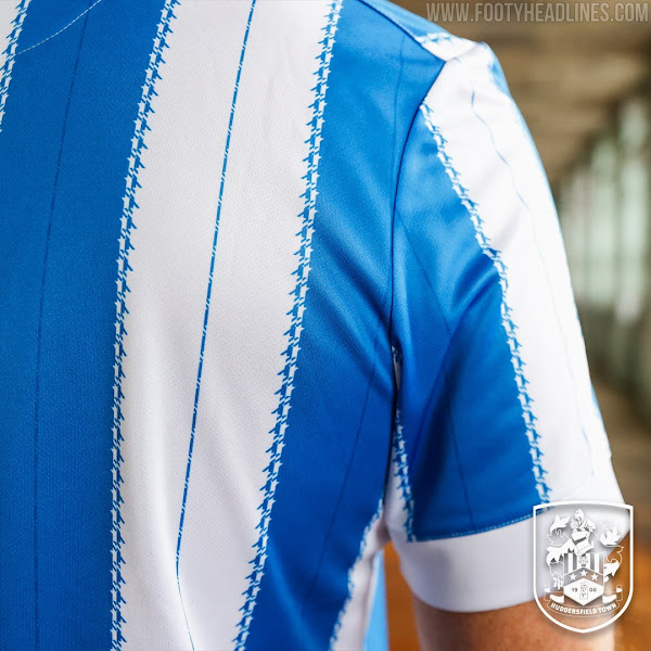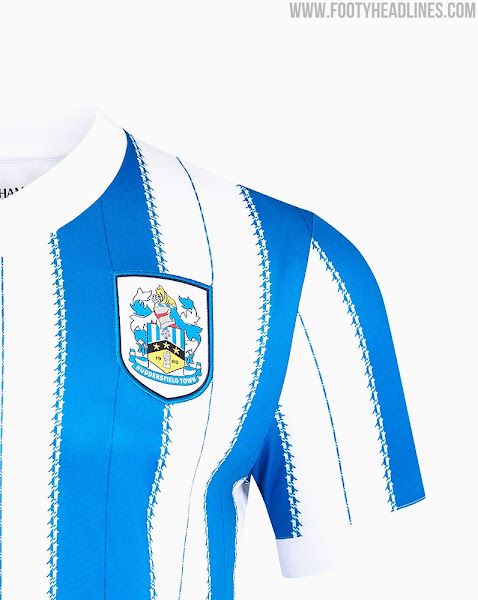 The Umbro Huddersfield 24-25 shirt pays homage to Huddersfield's textile heritage. It features subtle pinstripes and houndstooth detailing on the traditional blue and white stripes.