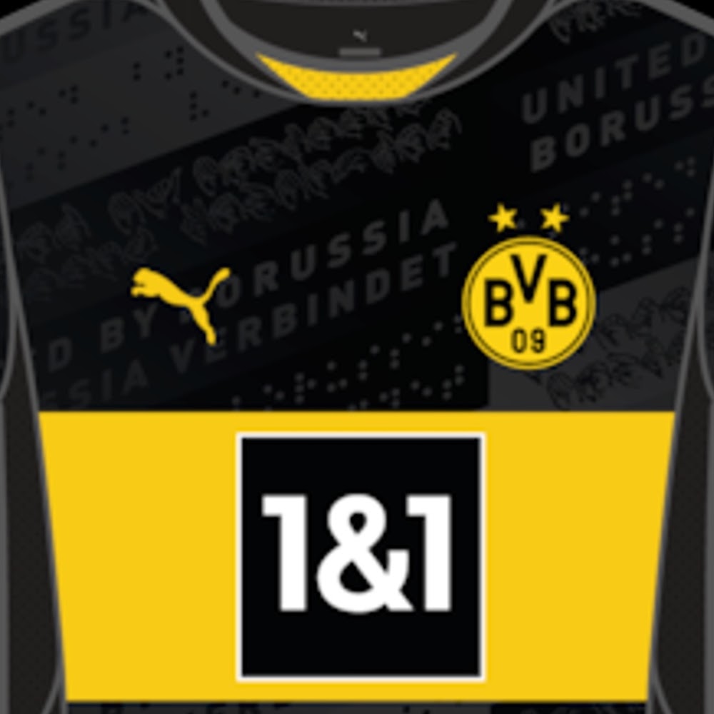 The black front features a very subtle pattern with the club's slogan, "Borussia verbindet". The slogan is there in German, English ("United by Borussia"), Braille ("⠃⠕⠗⠥⠎⠎⠊⠁ ⠧⠑⠗⠃⠊⠝⠙⠑⠞"), and at least one other variation.