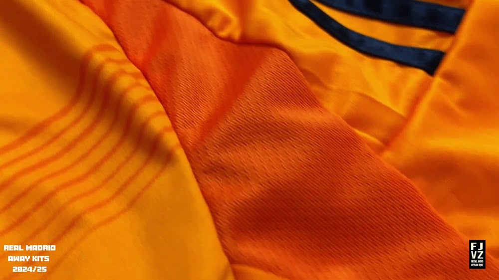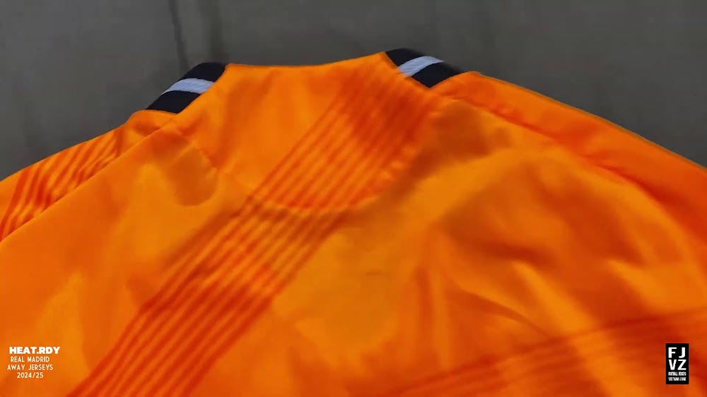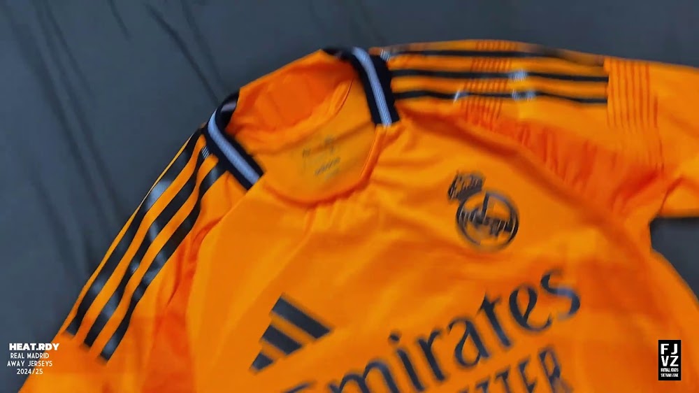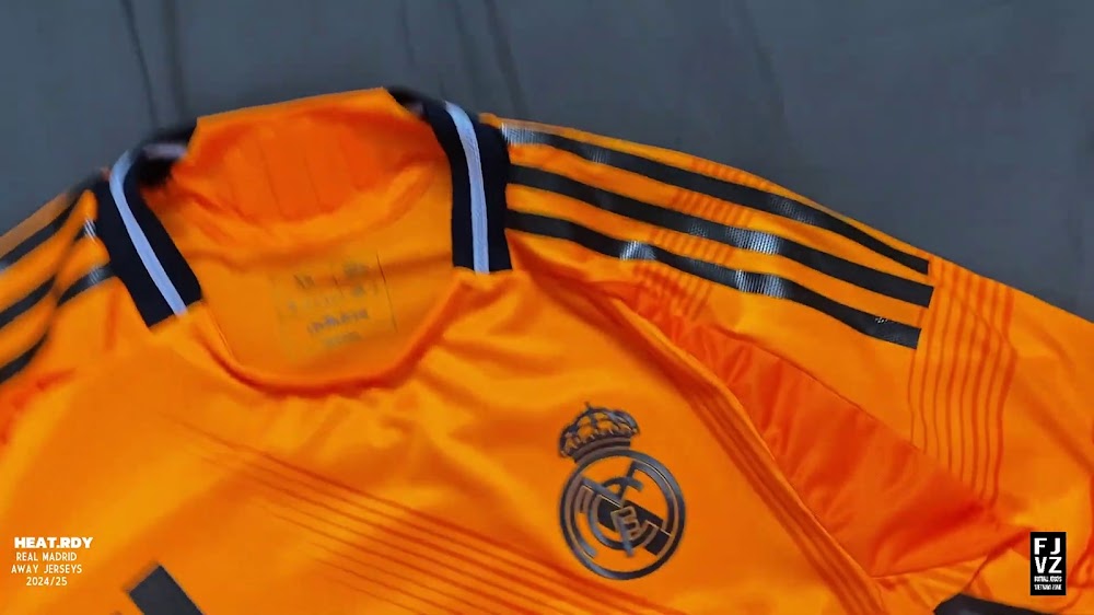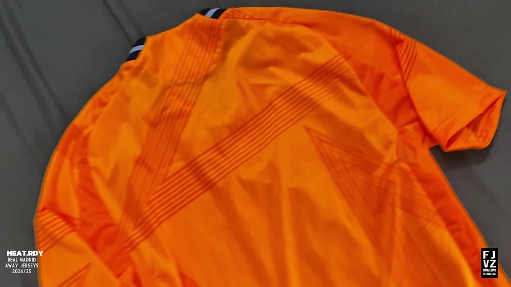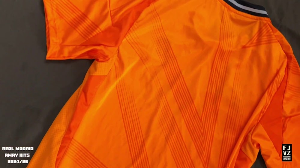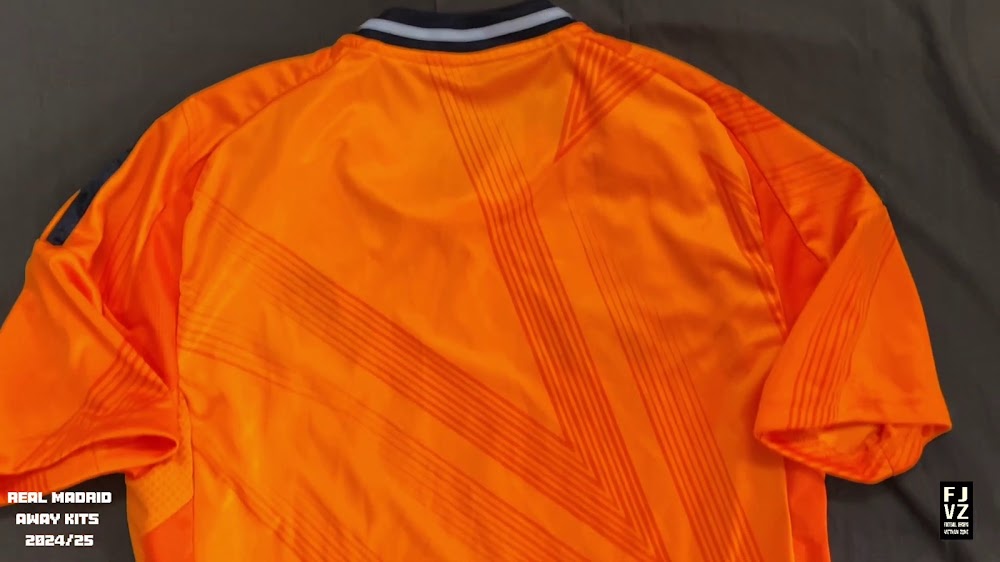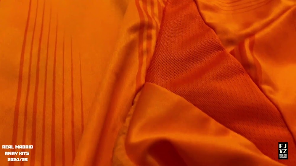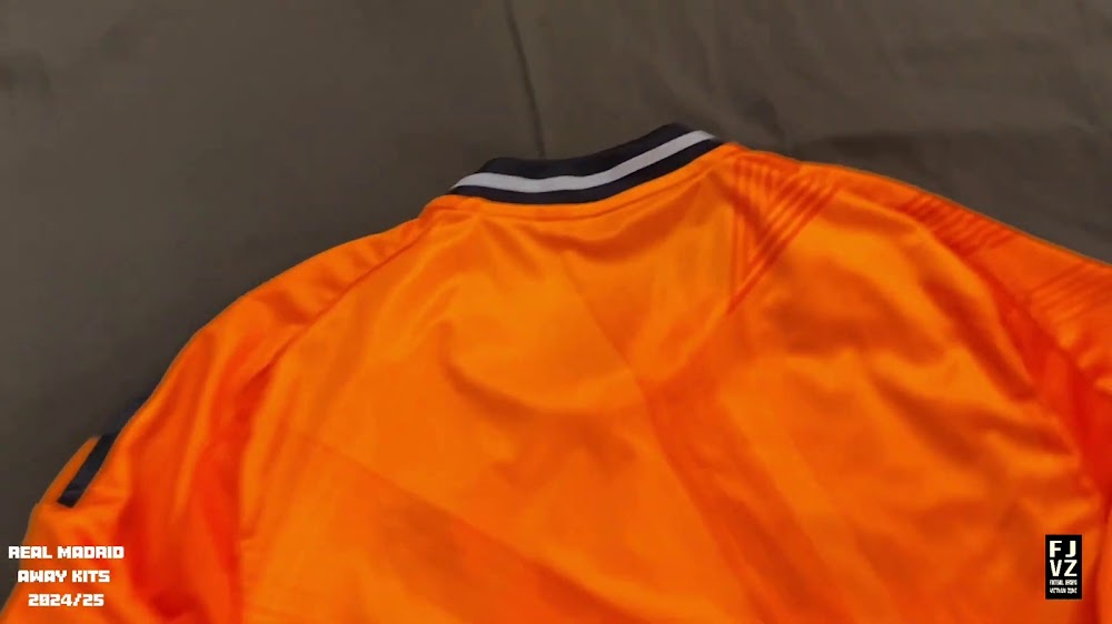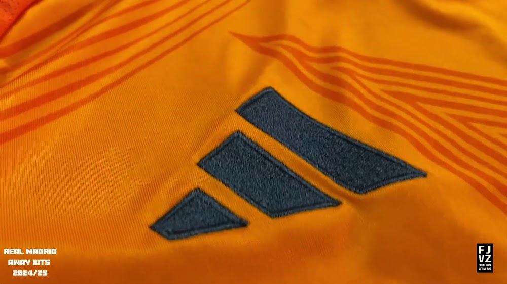 The new Adidas Real Madrid 24-25 away football shirt features colors reminiscent of the 2013-2014 third kit. It is predominantly bright orange with black applications. The collar comes with white detailing.