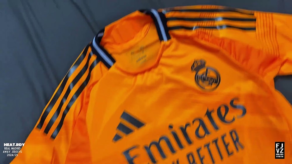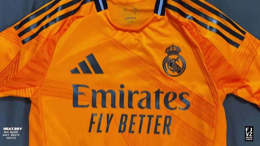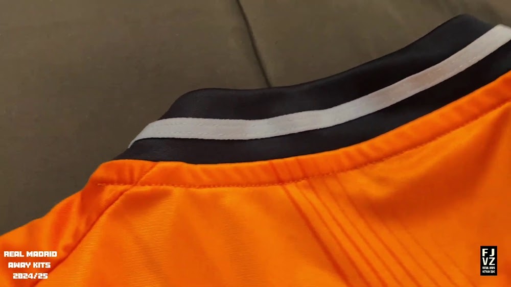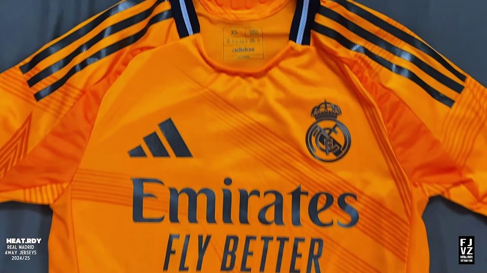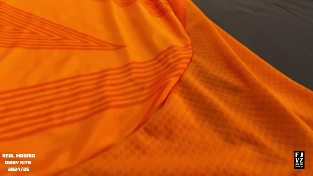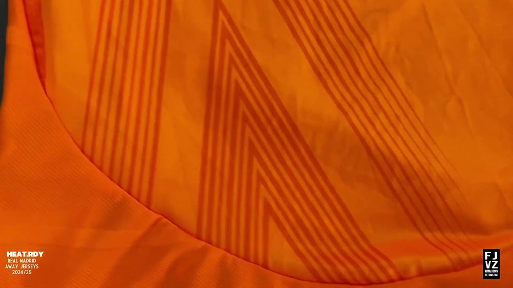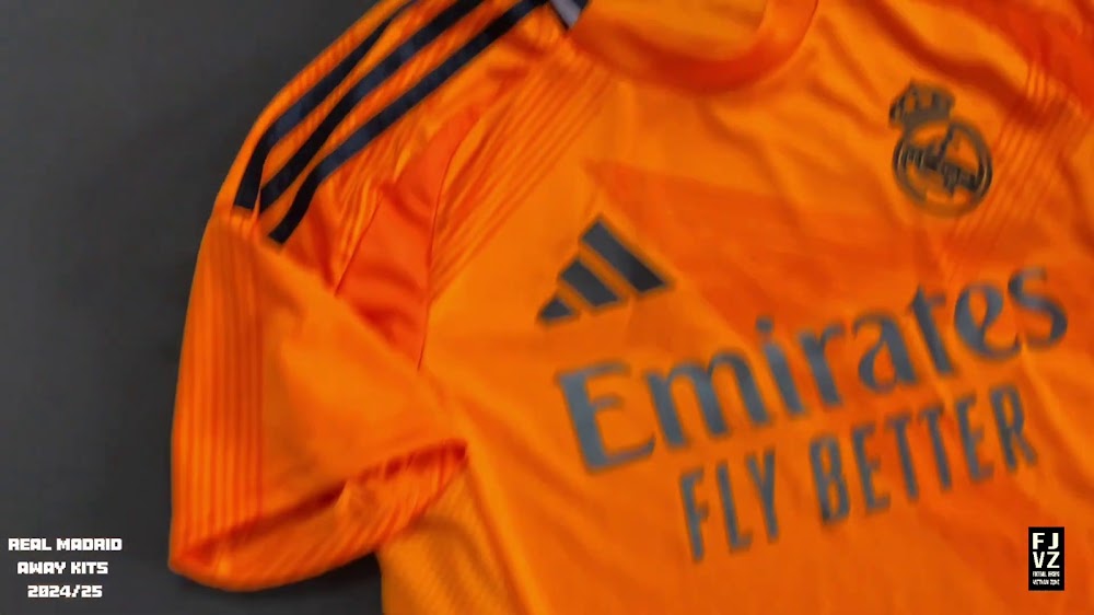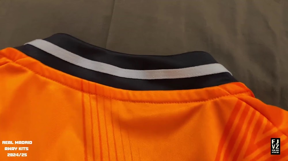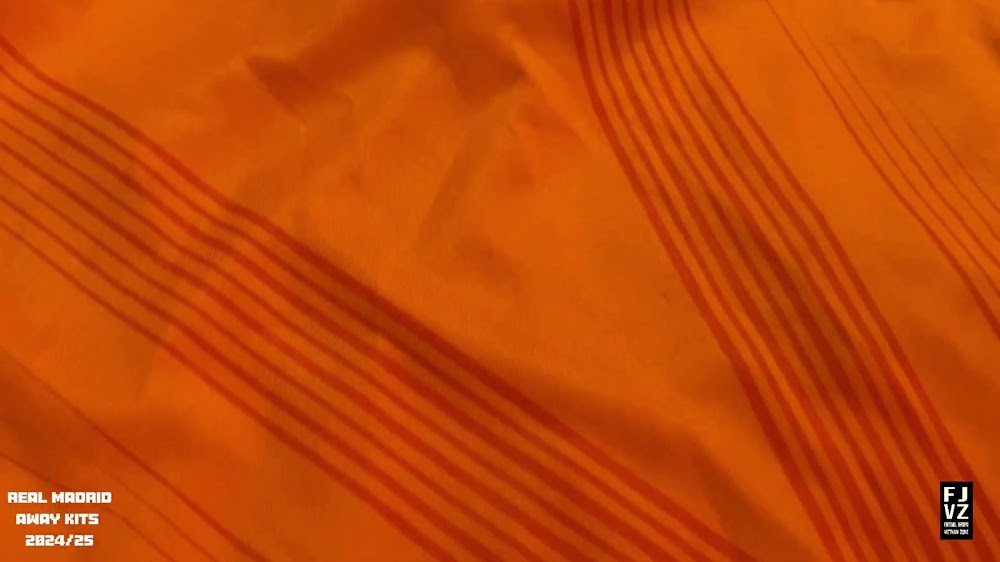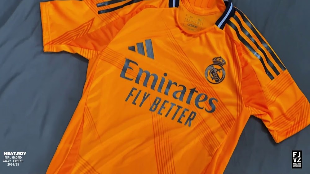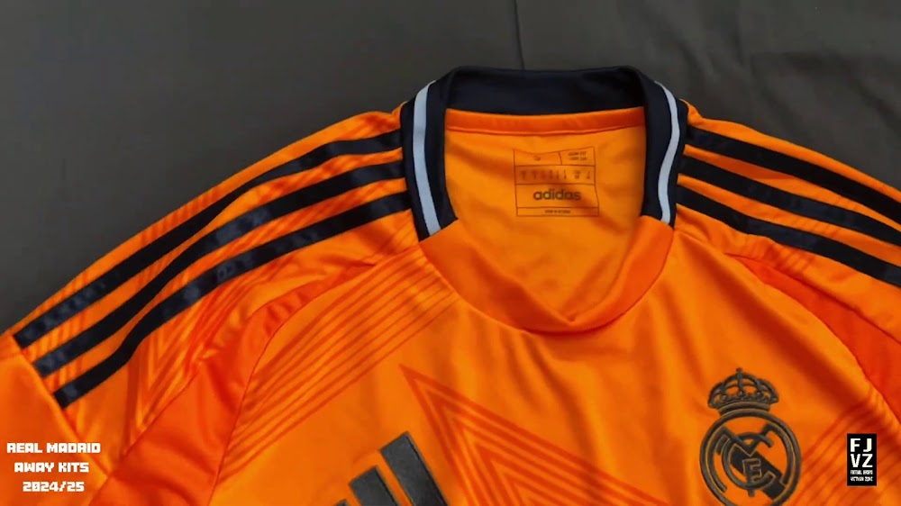 The new Adidas Real Madrid 24-25 away football shirt features colors reminiscent of the 2013-2014 third kit. It is predominantly bright orange with black applications. The collar comes with white detailing.