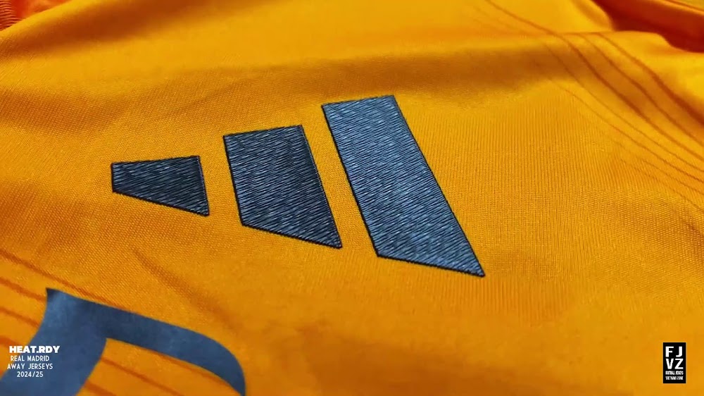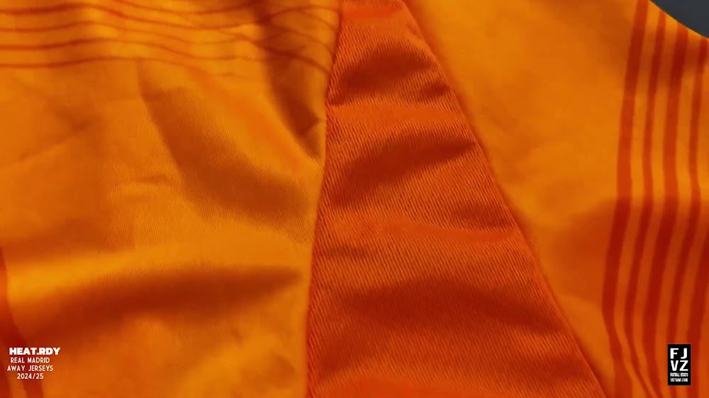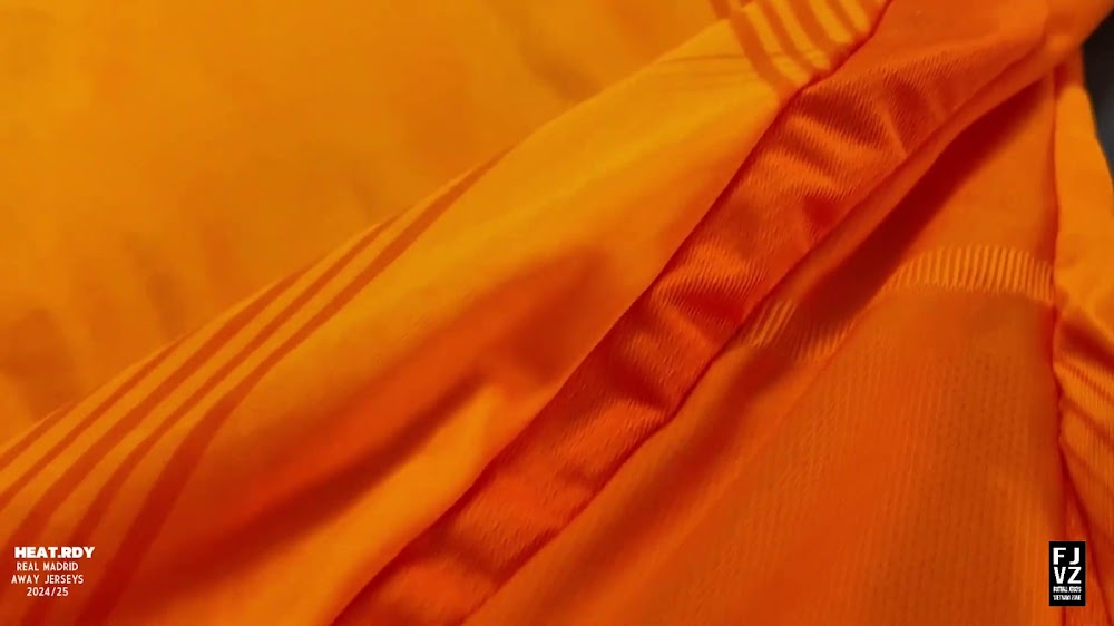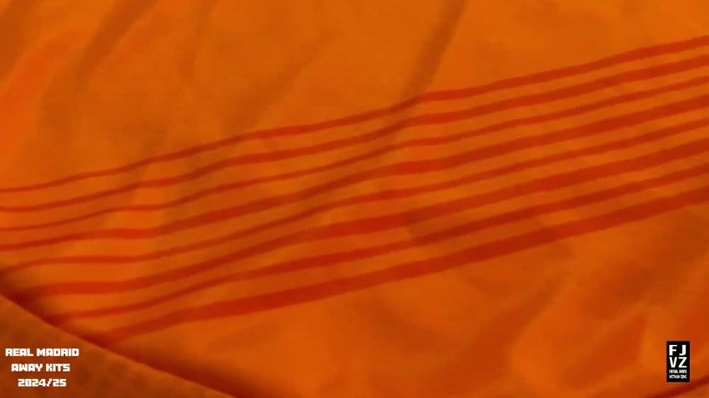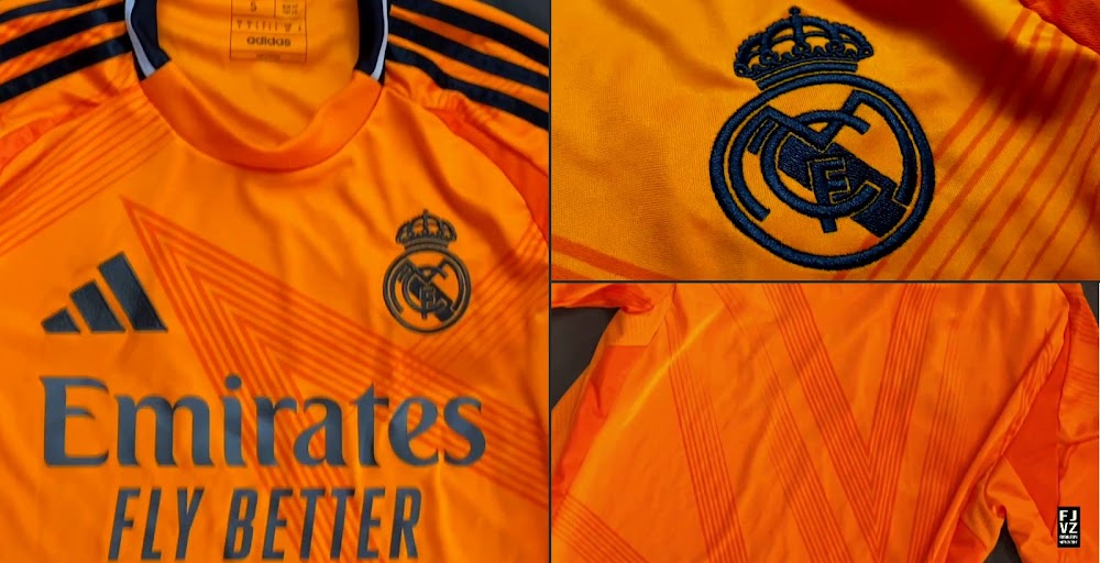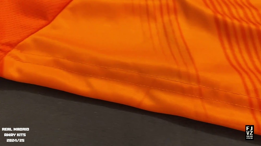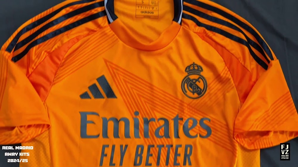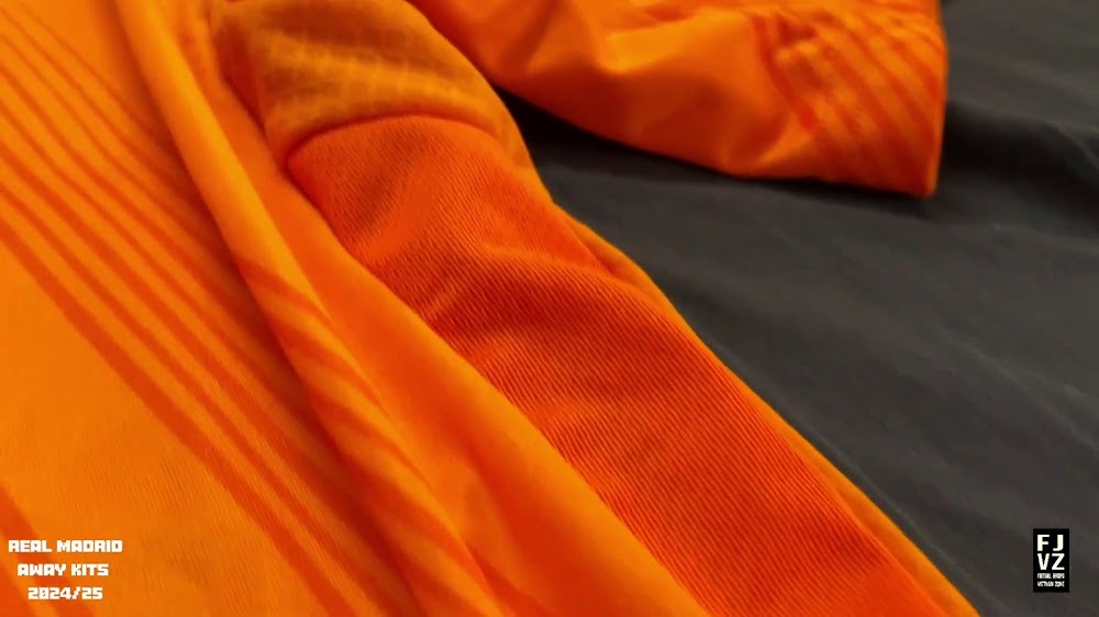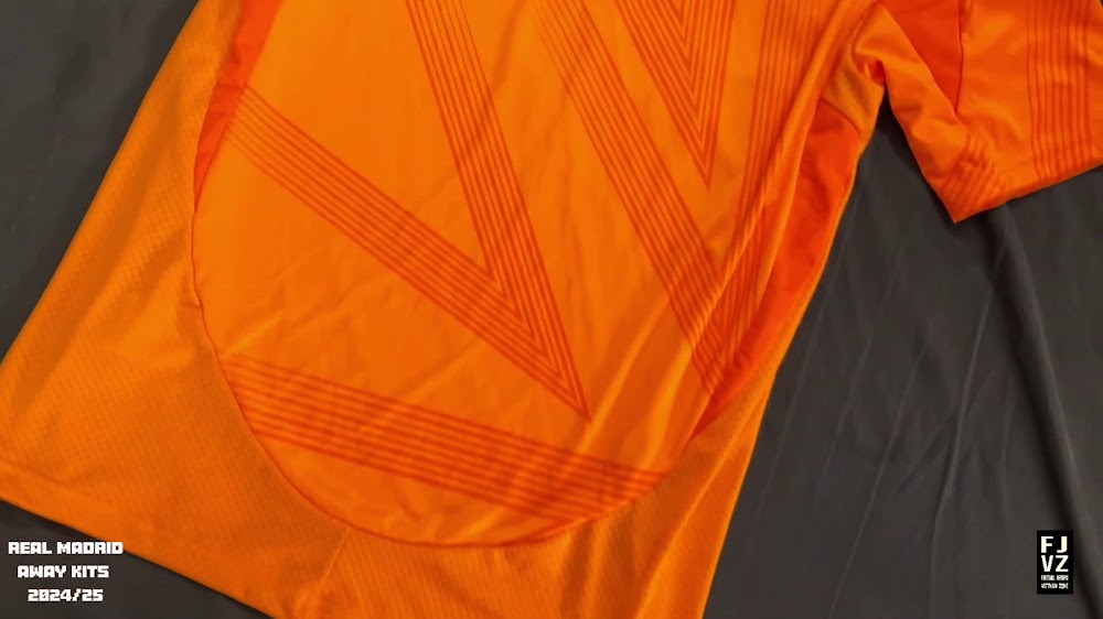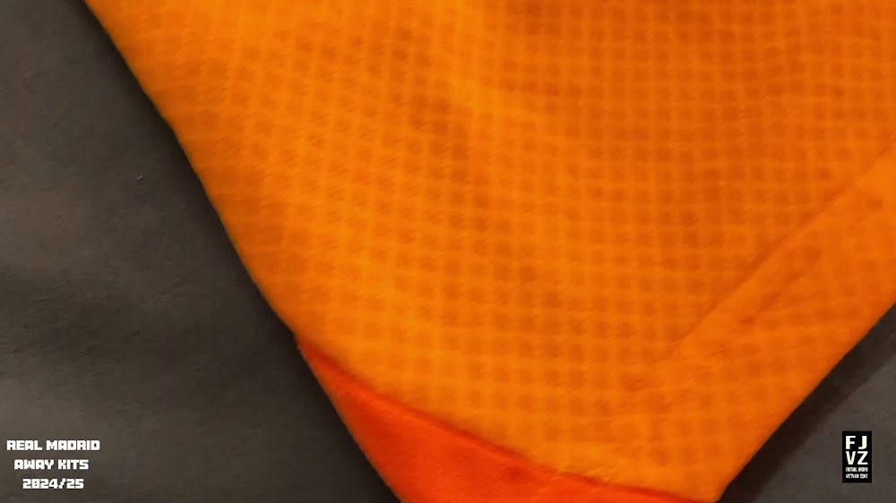 The new Adidas Real Madrid 24-25 away football shirt features colors reminiscent of the 2013-2014 third kit. It is predominantly bright orange with black applications. The collar comes with white detailing.