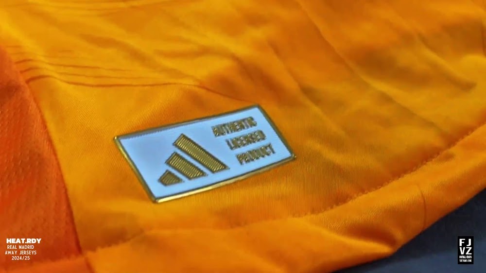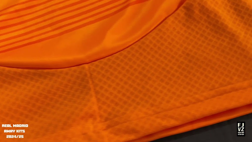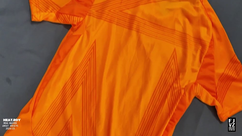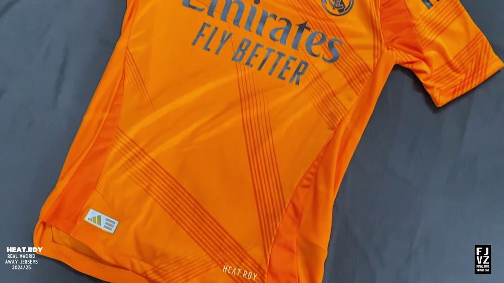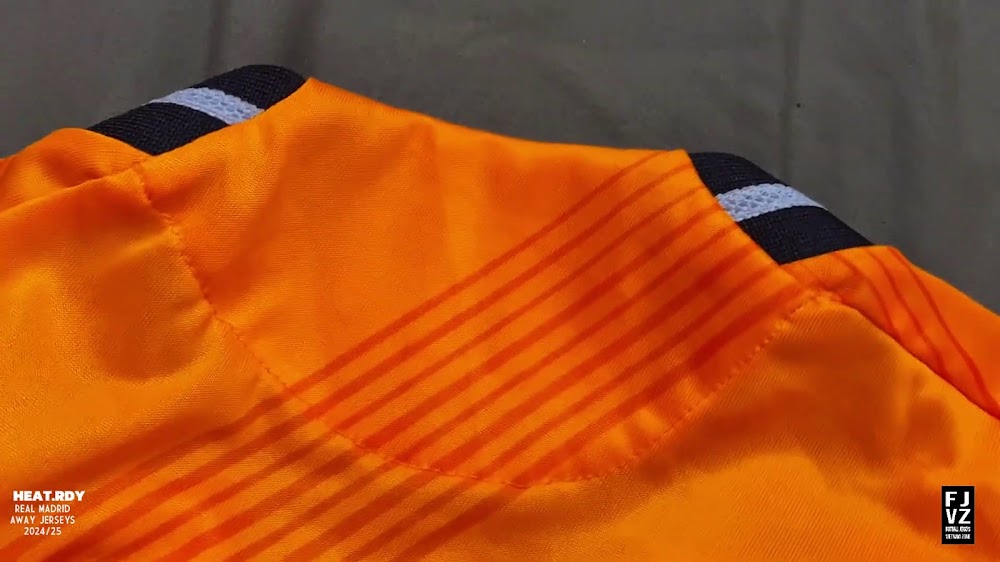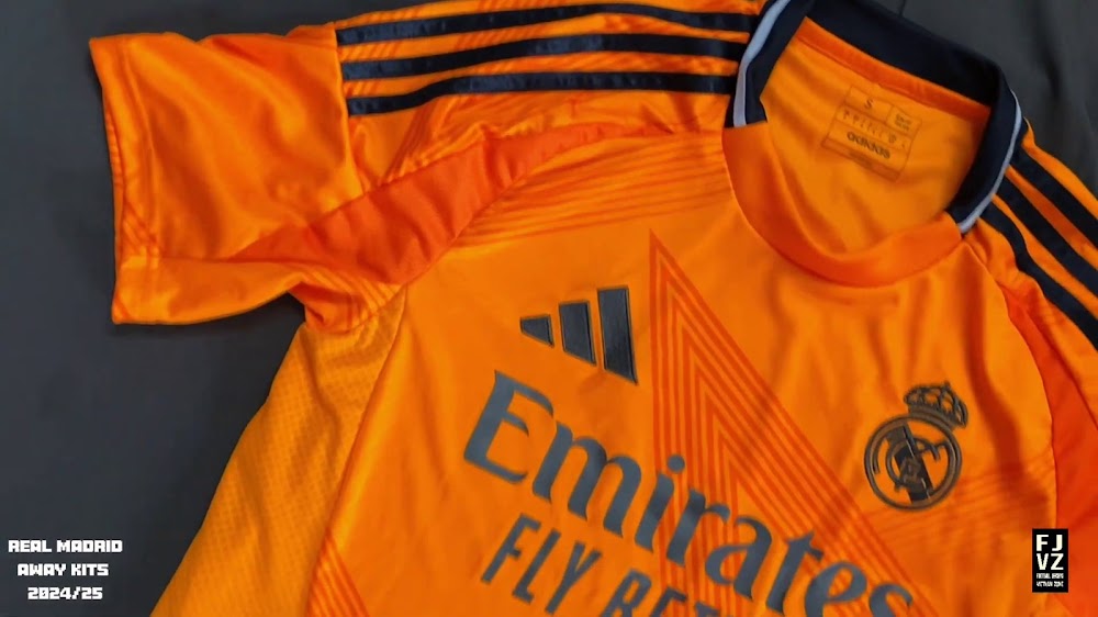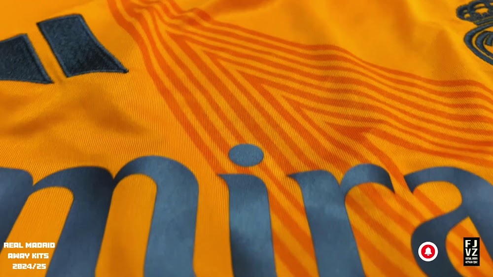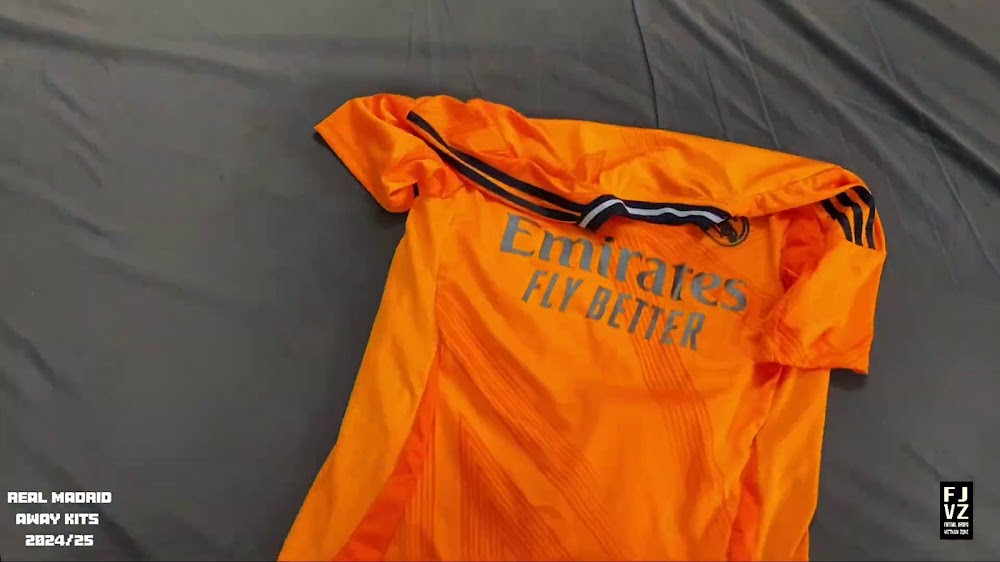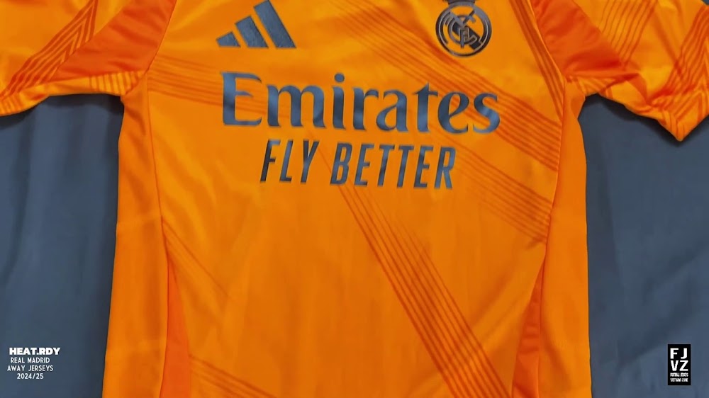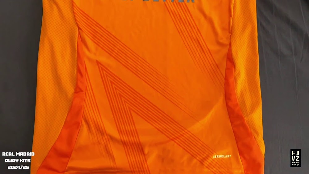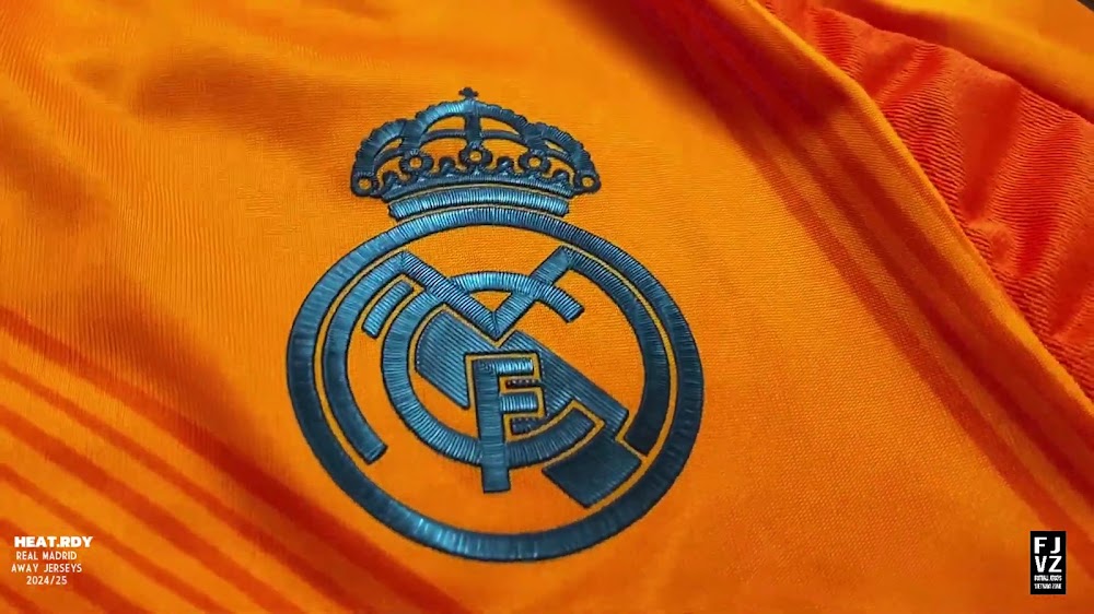 The new Adidas Real Madrid 24-25 away football shirt features colors reminiscent of the 2013-2014 third kit. It is predominantly bright orange with black applications. The collar comes with white detailing.