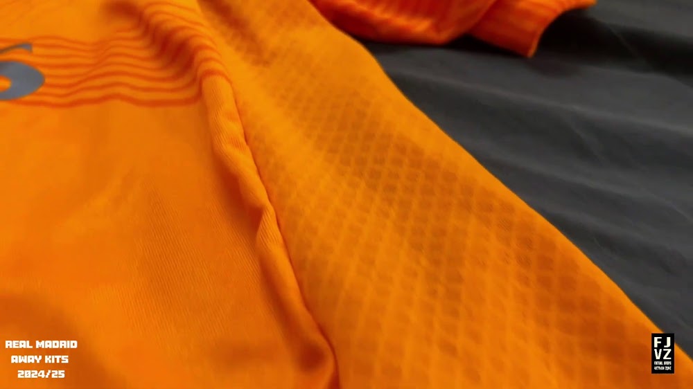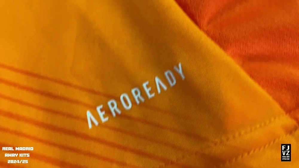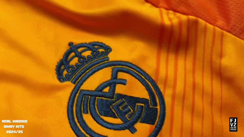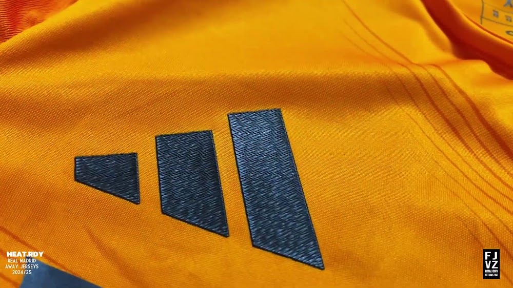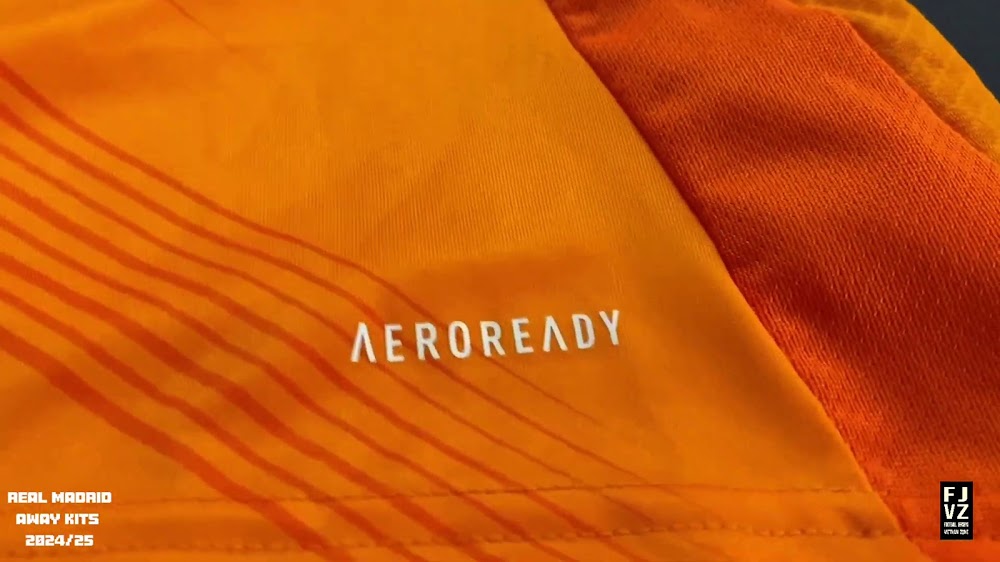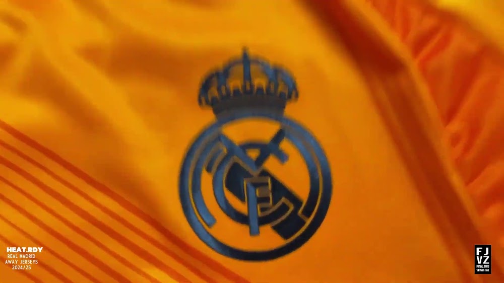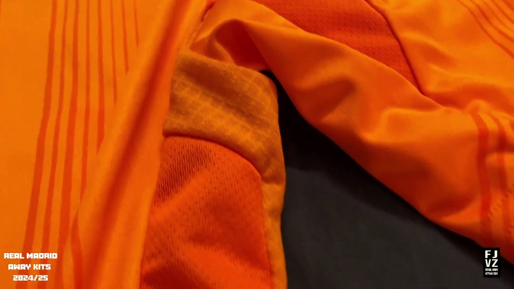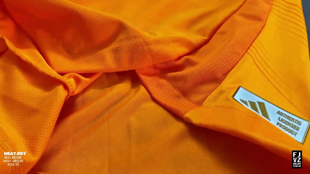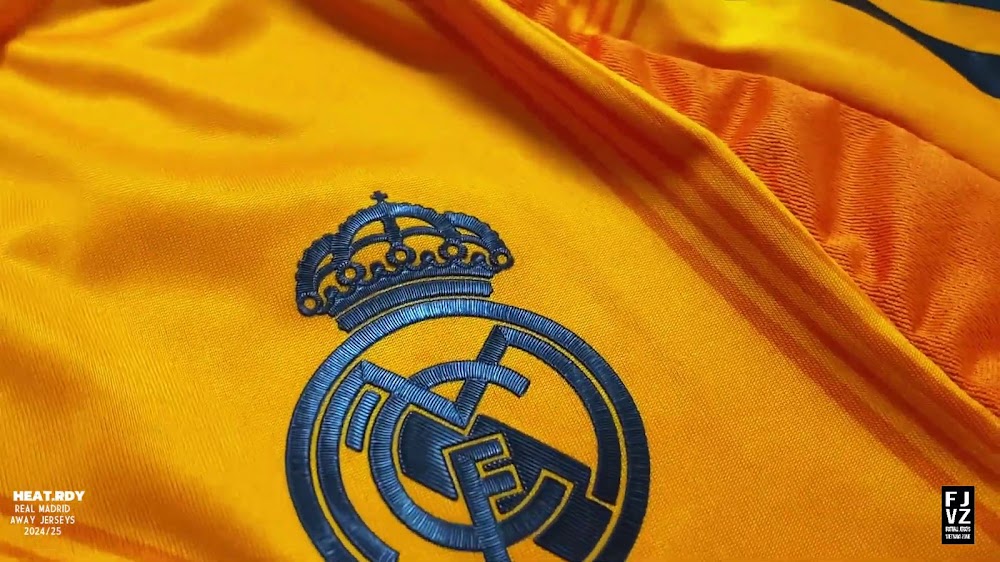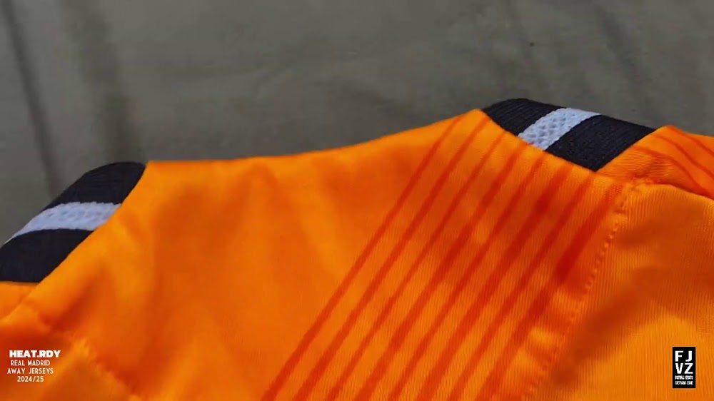 The new Adidas Real Madrid 24-25 away football shirt features colors reminiscent of the 2013-2014 third kit. It is predominantly bright orange with black applications. The collar comes with white detailing.