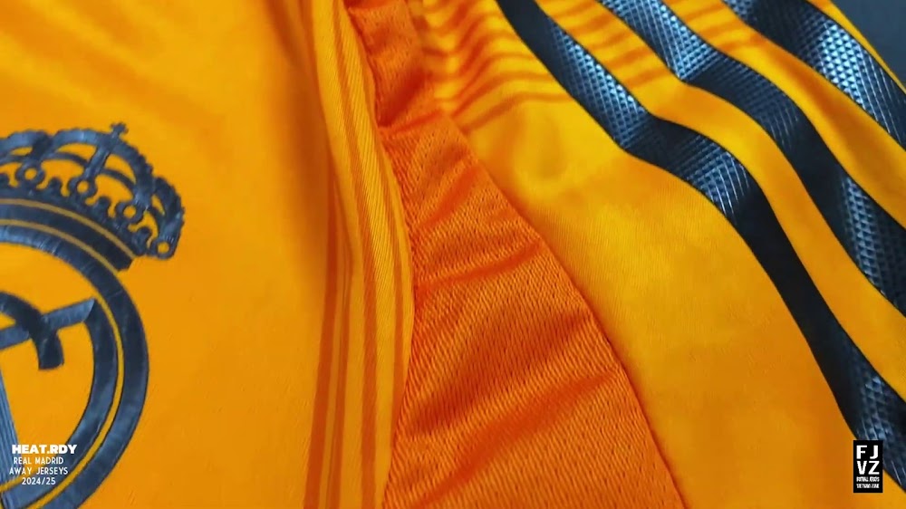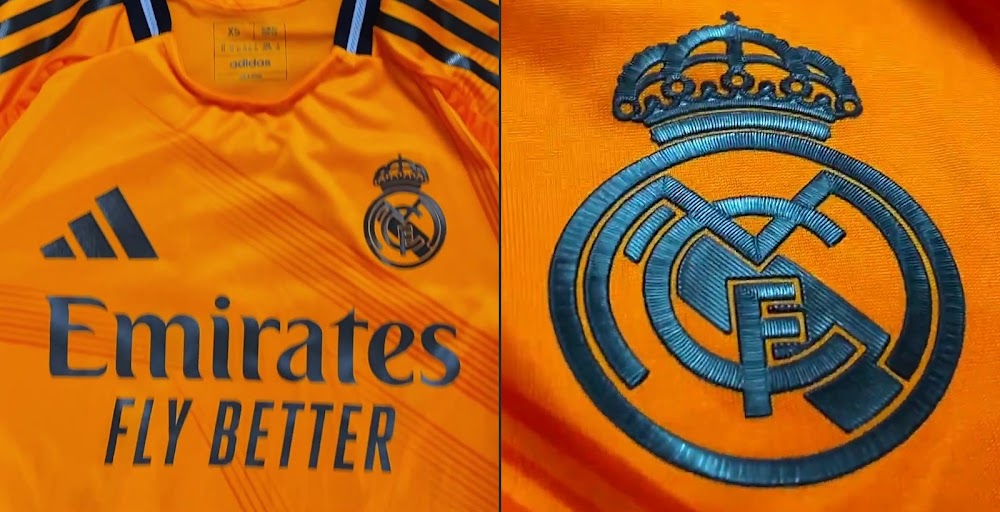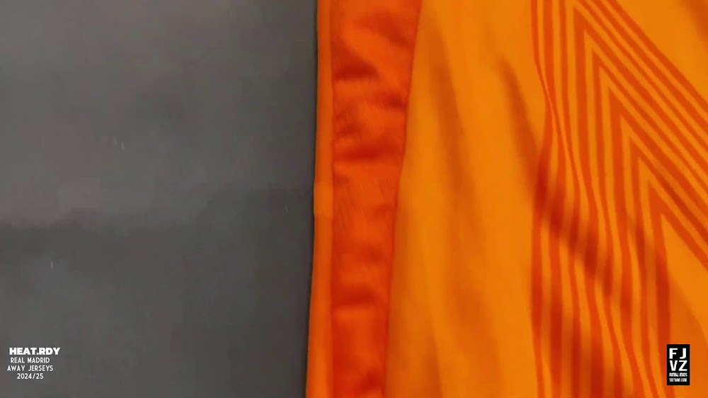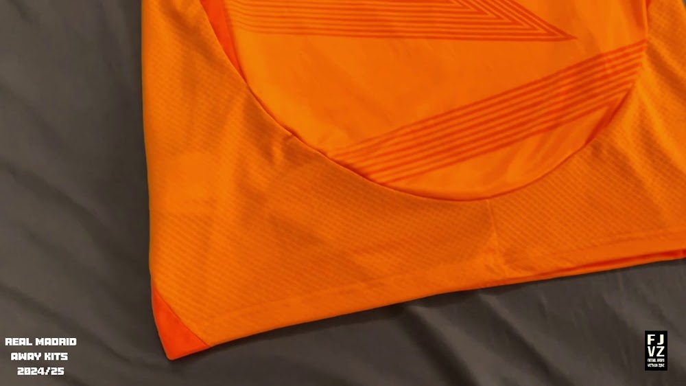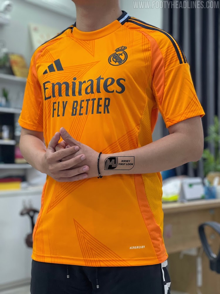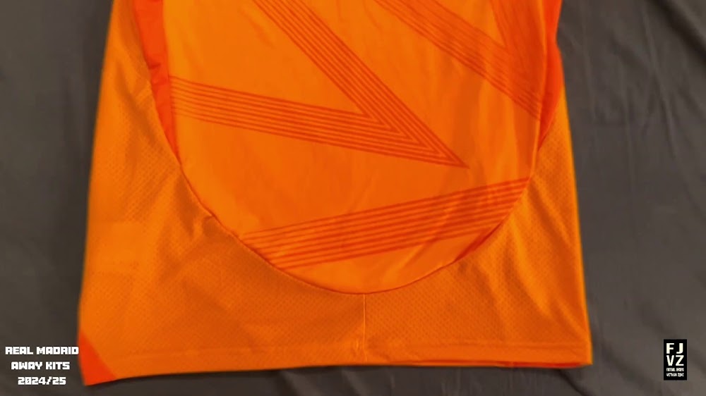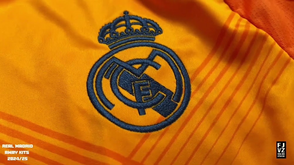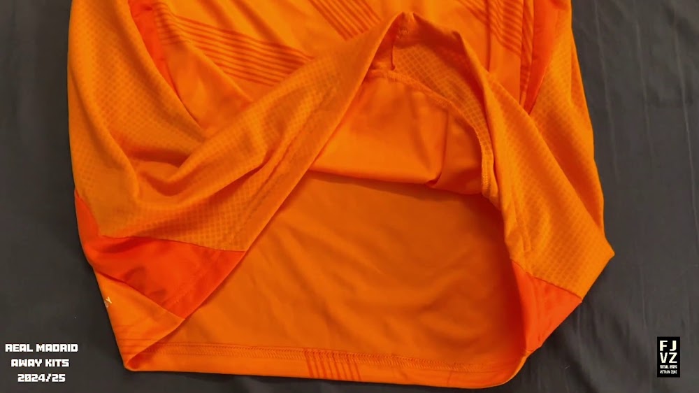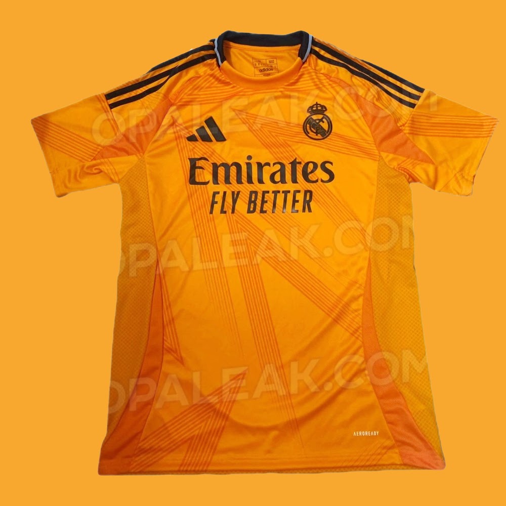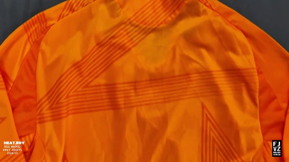 The new Adidas Real Madrid 24-25 away football shirt features colors reminiscent of the 2013-2014 third kit. It is predominantly bright orange with black applications. The collar comes with white detailing.