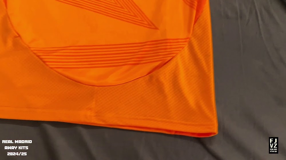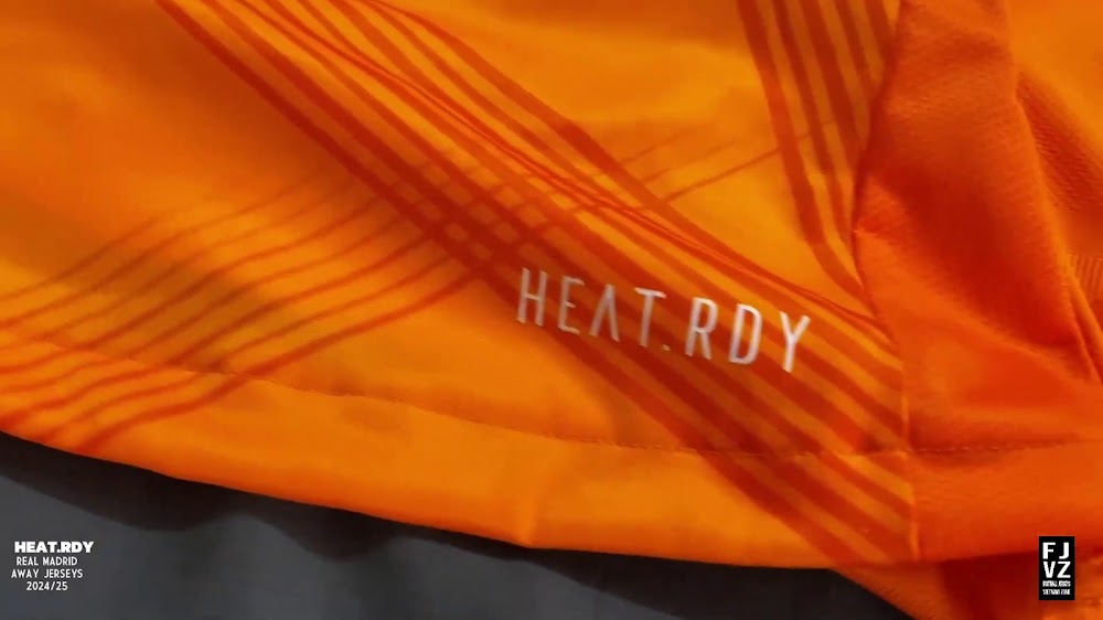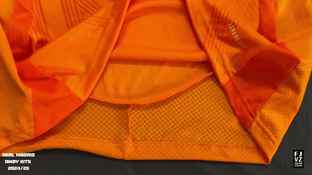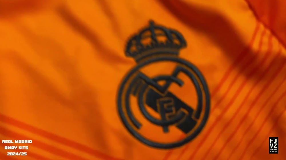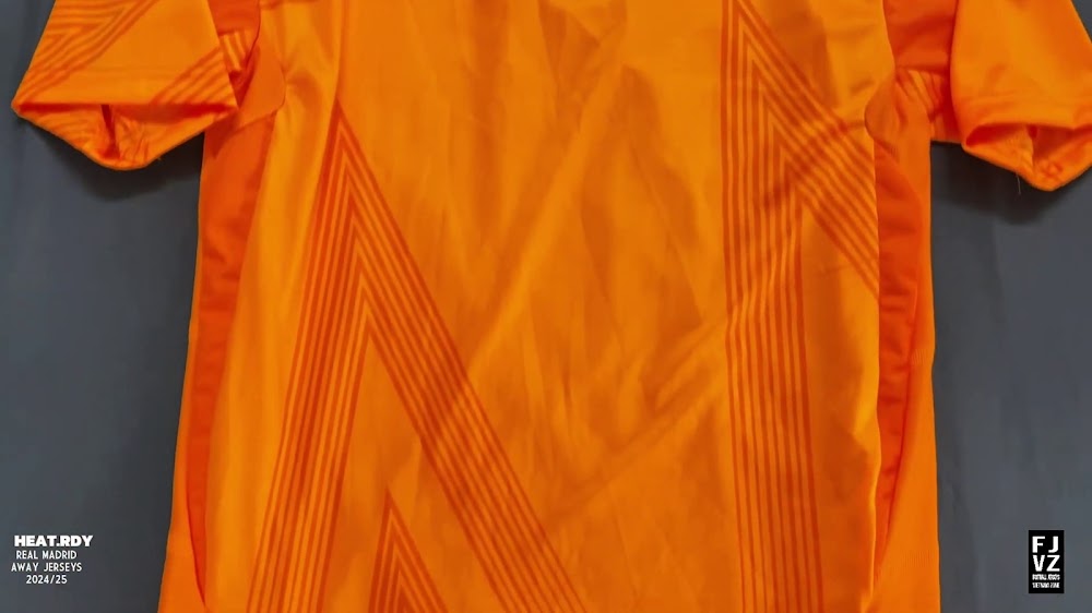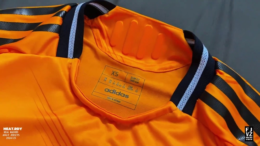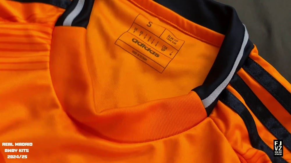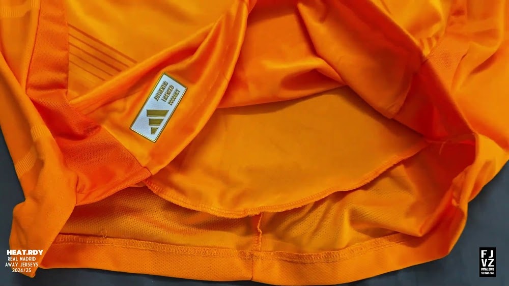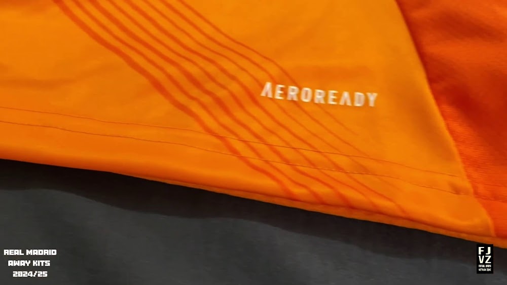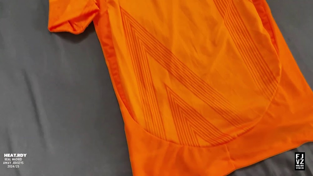 The new Adidas Real Madrid 24-25 away football shirt features colors reminiscent of the 2013-2014 third kit. It is predominantly bright orange with black applications. The collar comes with white detailing.