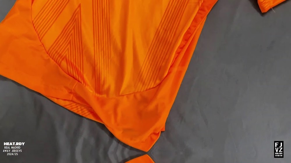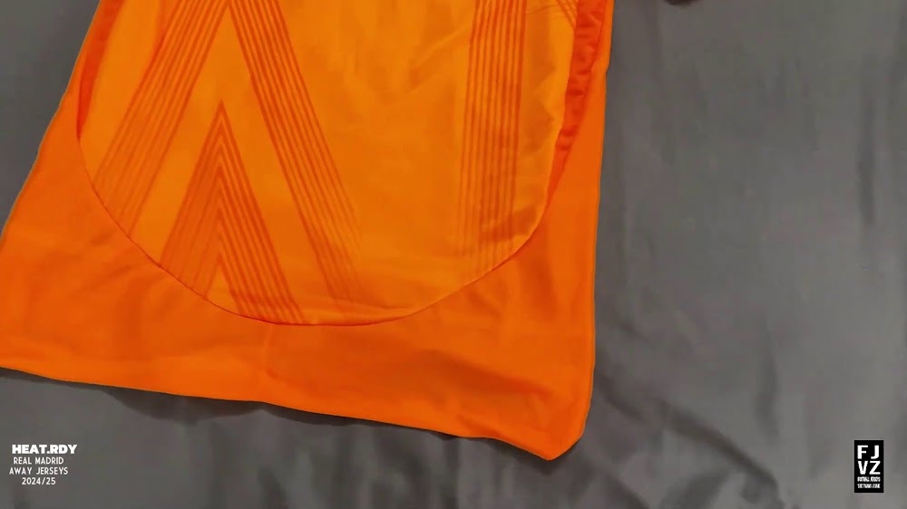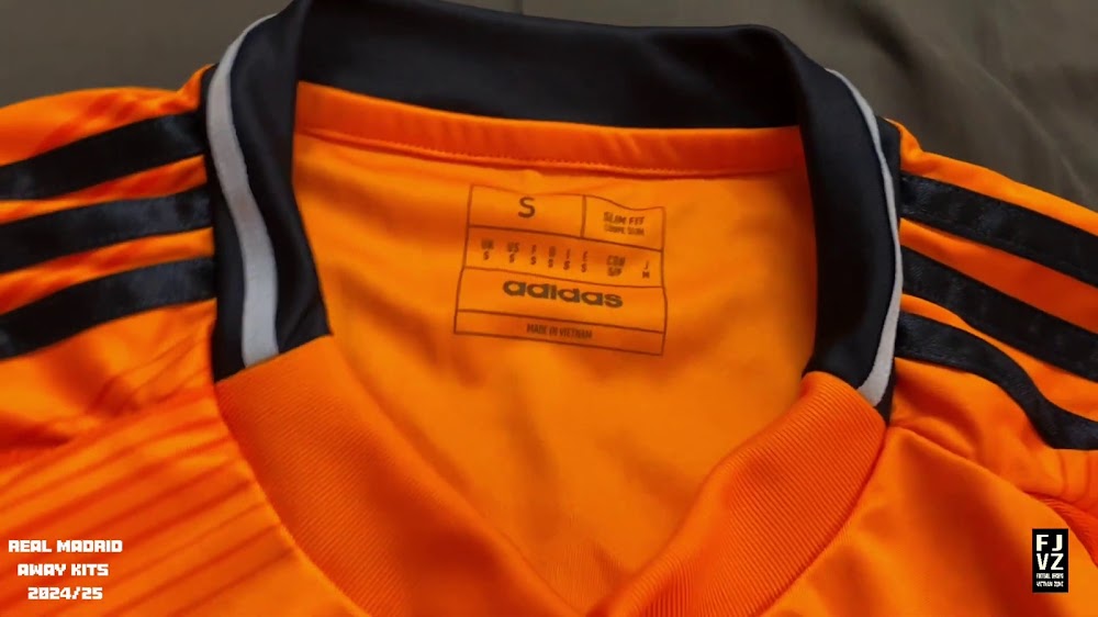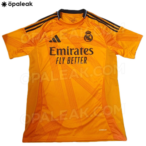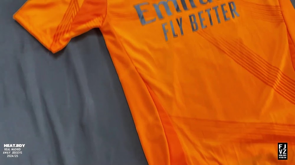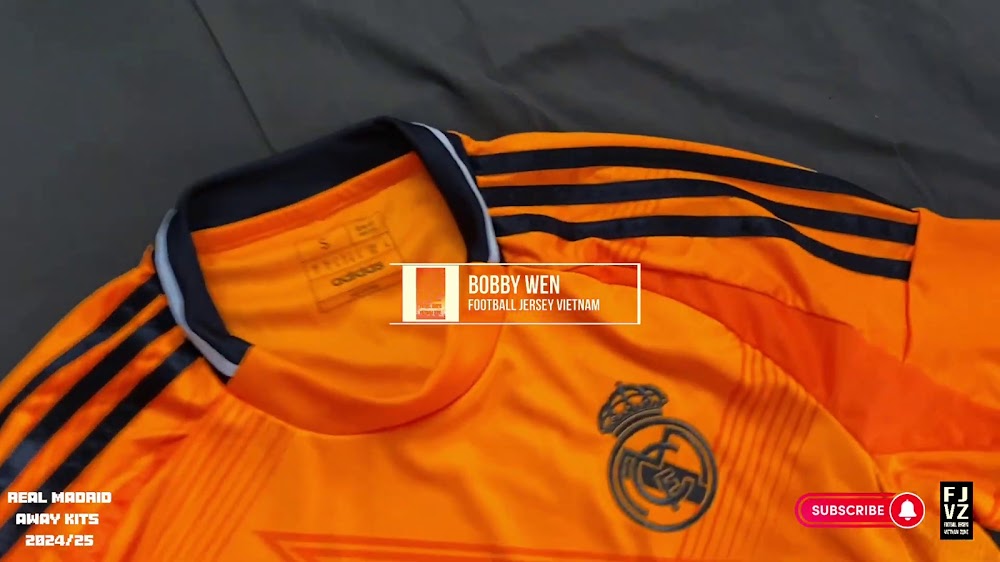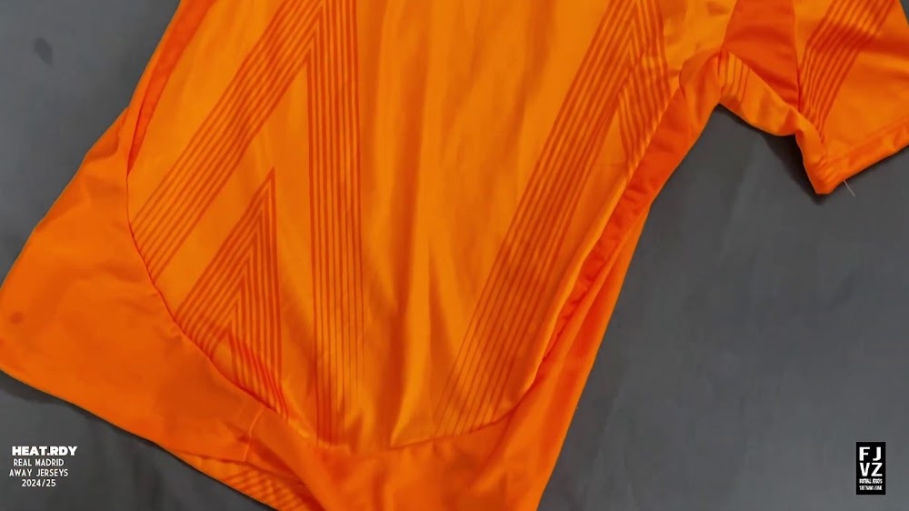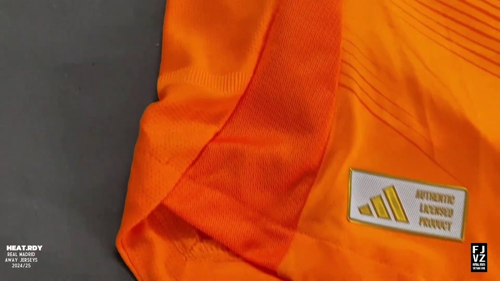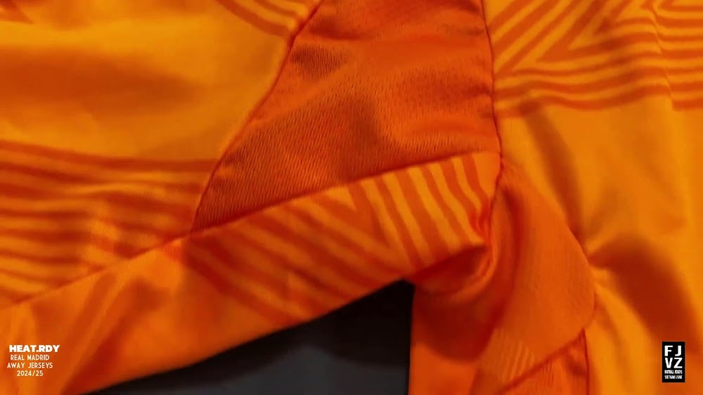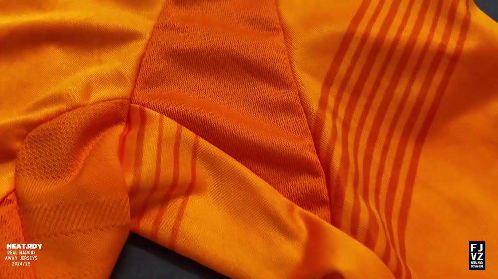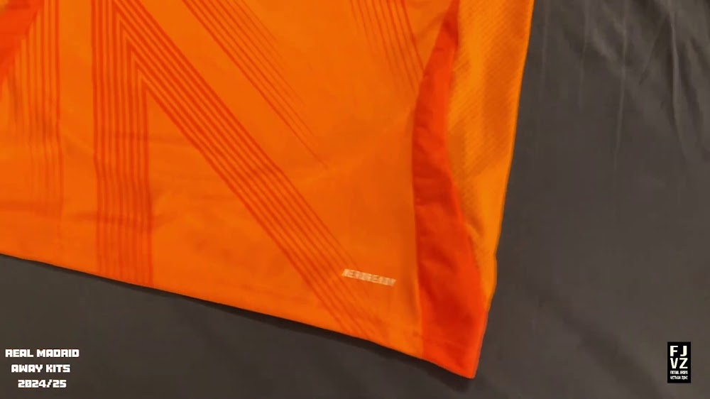 The new Adidas Real Madrid 24-25 away football shirt features colors reminiscent of the 2013-2014 third kit. It is predominantly bright orange with black applications. The collar comes with white detailing.