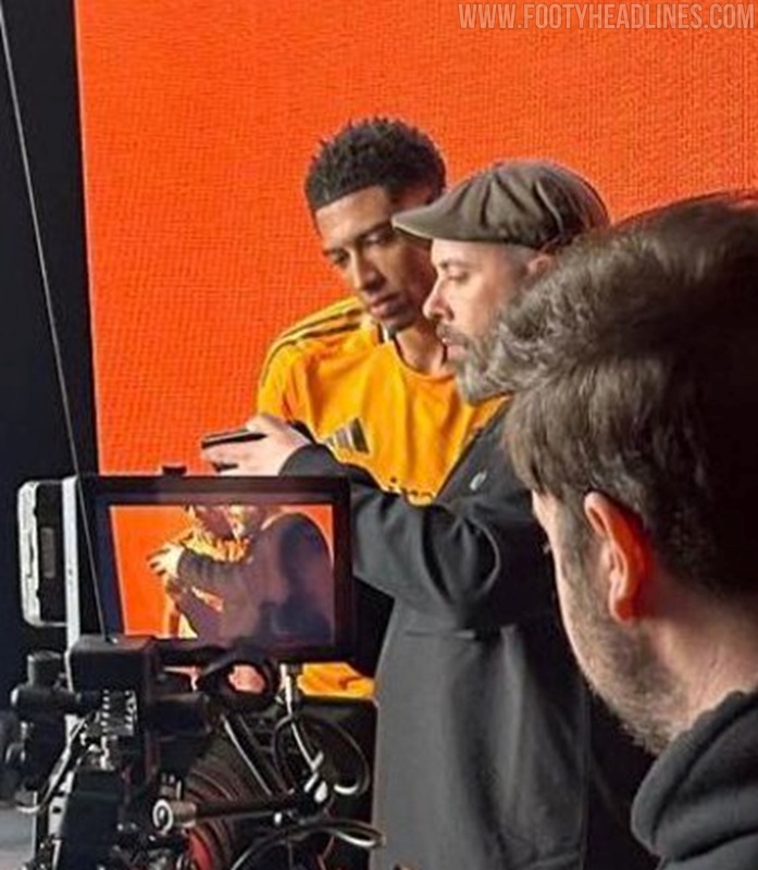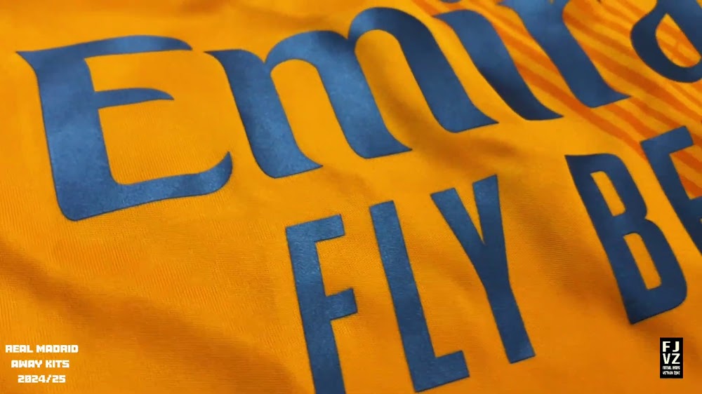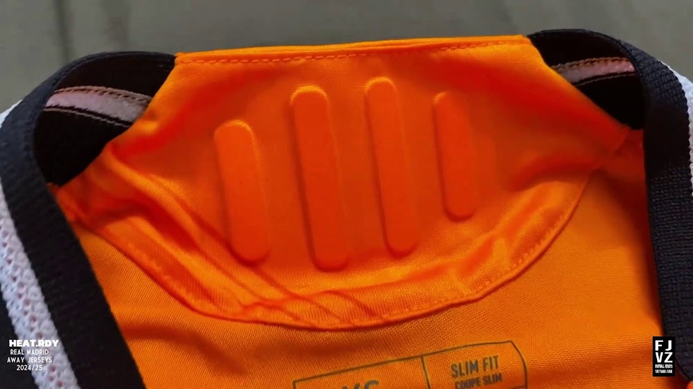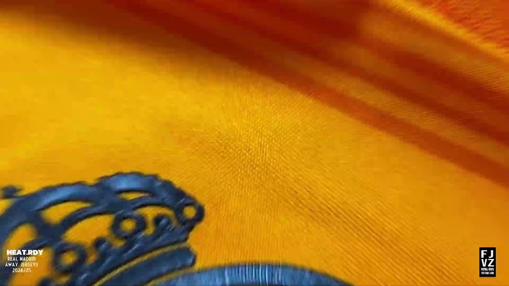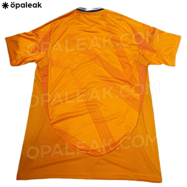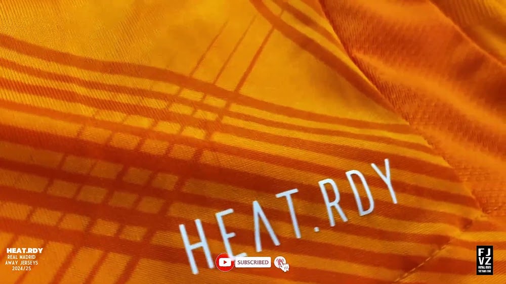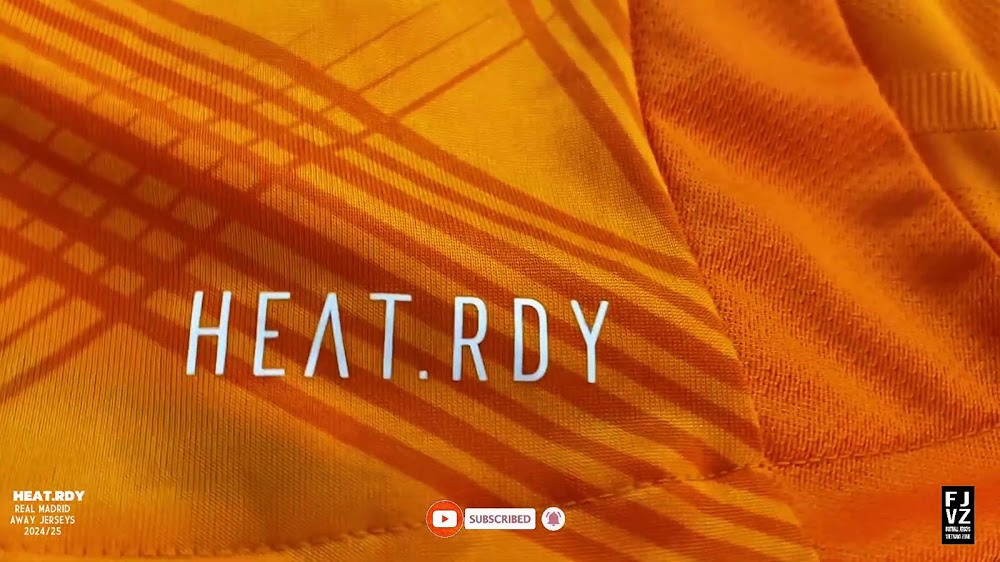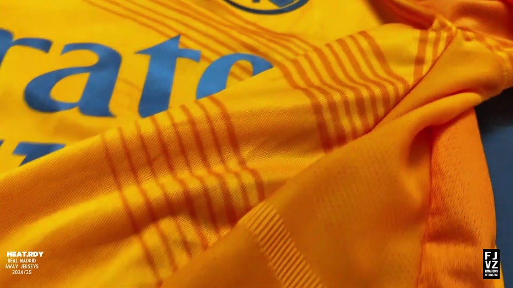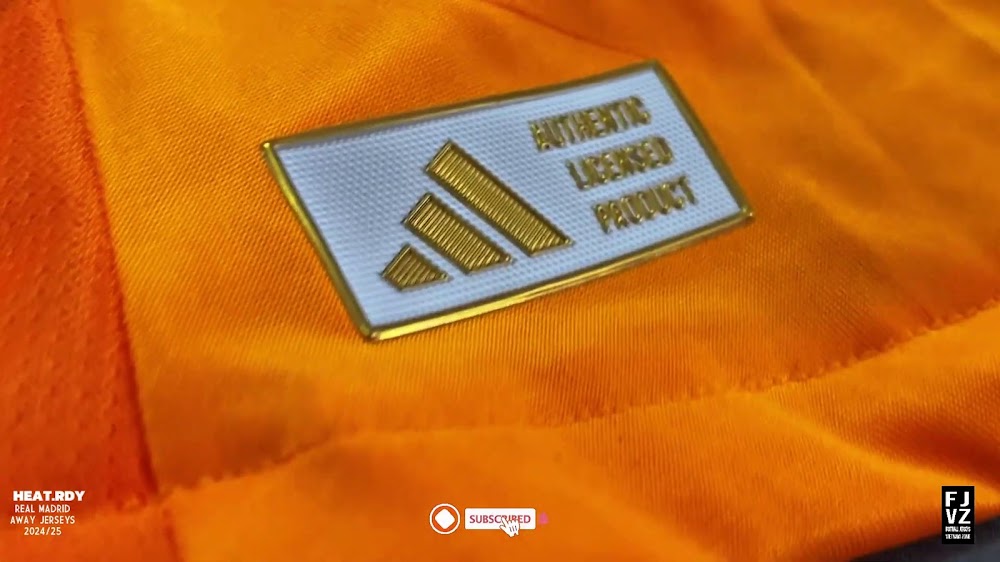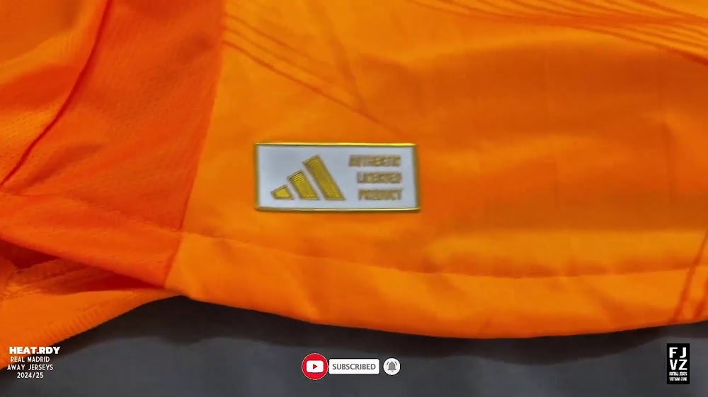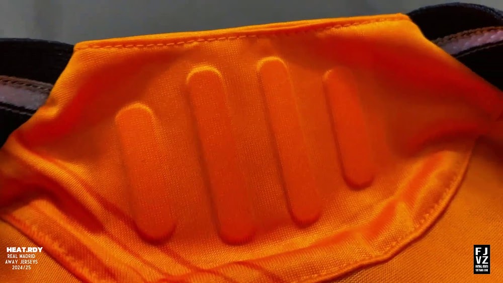 The new Adidas Real Madrid 24-25 away football shirt features colors reminiscent of the 2013-2014 third kit. It is predominantly bright orange with black applications. The collar comes with white detailing.