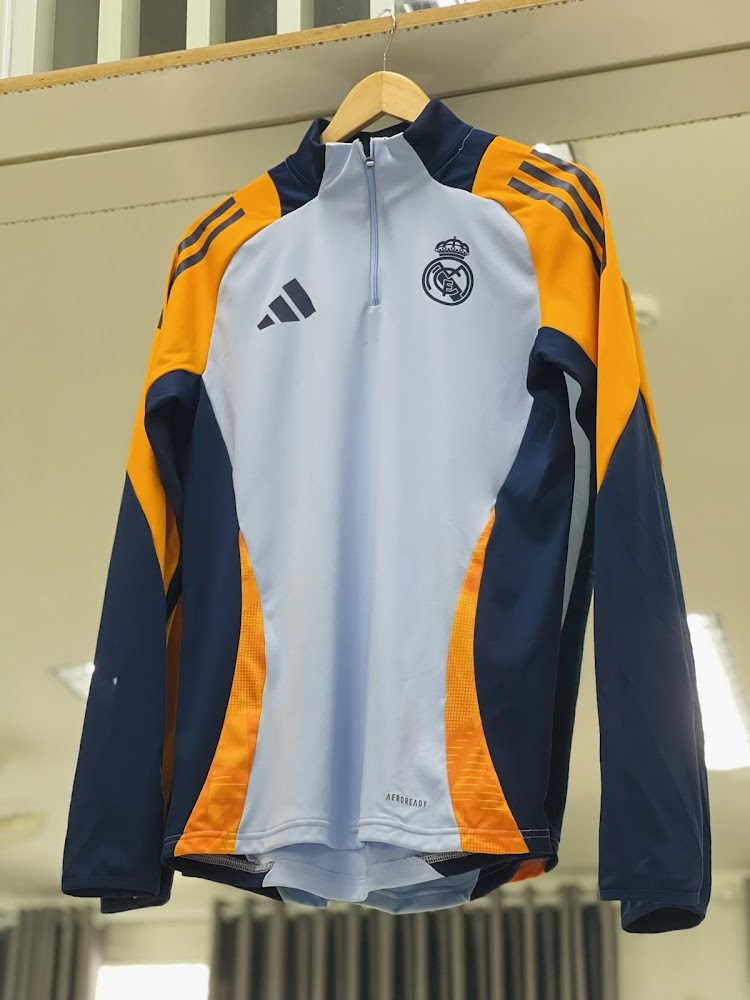 The Real Madrid 24-25 training top features the same orange color as the 24-25 away shirt, combined with two shades of blue.