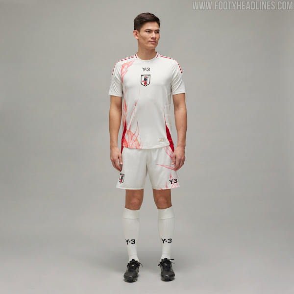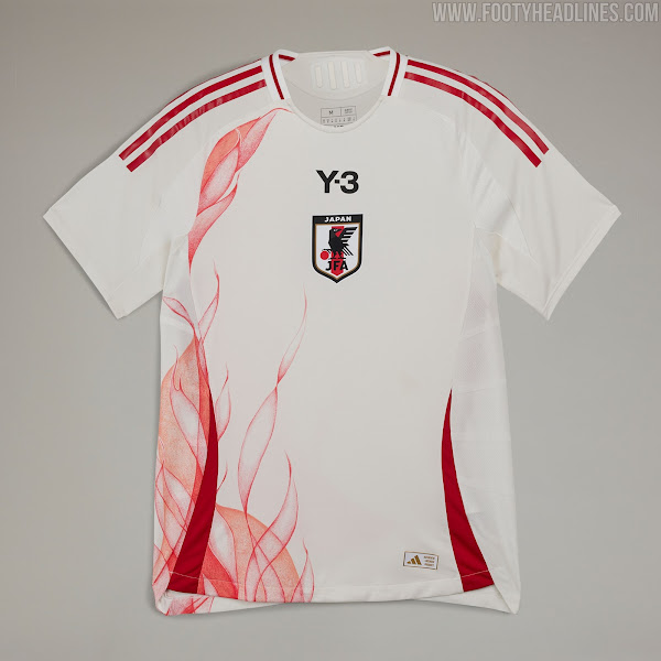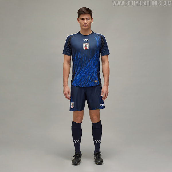 The Yamamoto Japan 2024 home, away and goalkeeper kits all feature the Y-3 logo in place of the Adidas logo, and share a theme of flame graphics, inspired by the "unwavering strength of the Japan National Football Team and the mysterious power of the country of Japan."