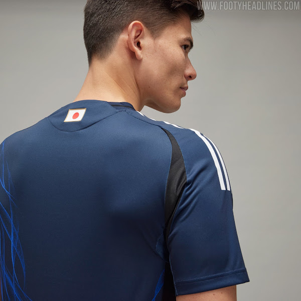 The Adidas Y-3 Japanese national football team 2024 home football shirt returns to a navy main color. This is the first time since 2018 that the Japan kit does not feature a bright blue.
